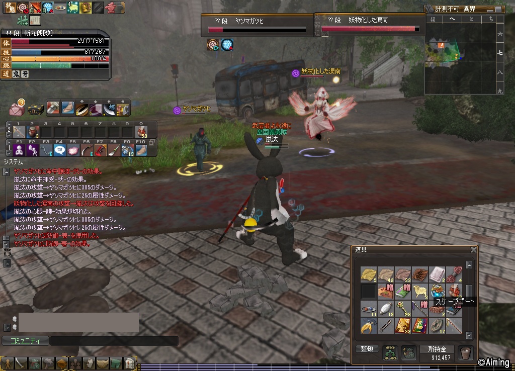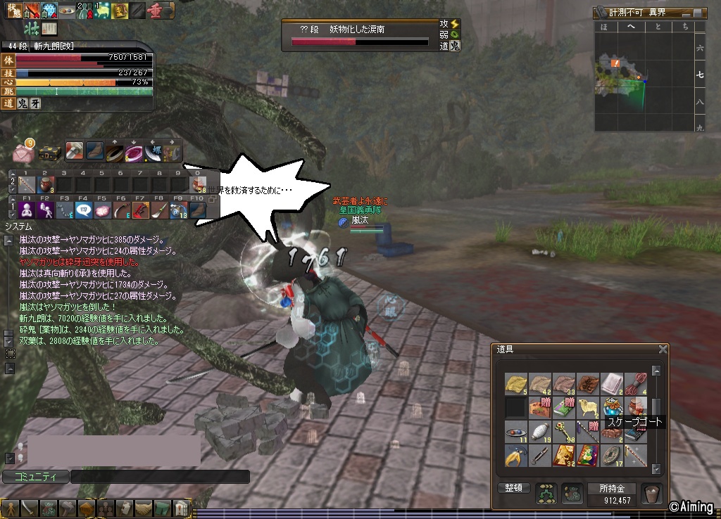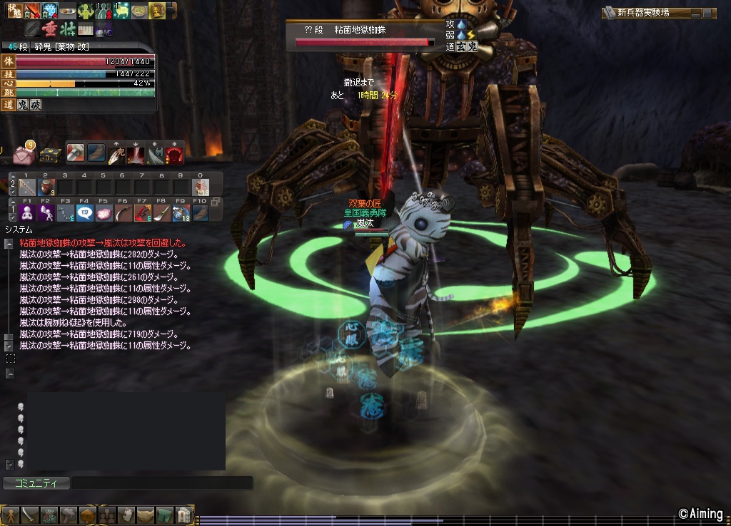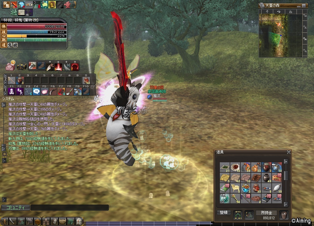 そして新MAPのうちの天蚕の森ですが、自分のプレイ環境の問題なのかやたら重くラグっているため、MOBの追撃を食らうわ行き先を方向転換で行き先見失う上に広いMAPで抜けるのは苦労しそうだったので断念しました。