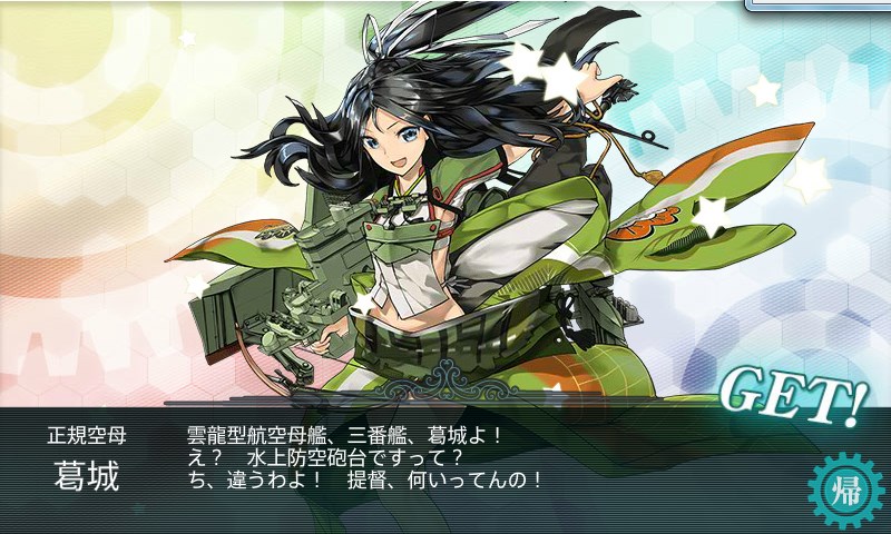 こちらは外出を挟みながらも苦労せずクリアして雲龍型空母「葛城」を獲得。