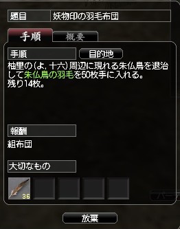 クエ自体は雑魚mobを倒して羽を集めると言うものでしたので、育成中の刀も帯刀して行った所、なぜか暴鳥を倒す流れに・・・