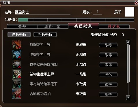 そういう訳で団員の意見を合わせて考えた結果、最初の兵団効果は業物確率アップとなりました。