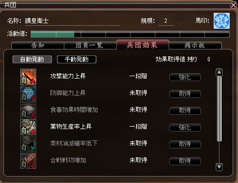本題ですが、兵団規模が2に上がった後しばらく放置してましたが、ようやく兵団効果を振りました。今回は攻撃力に振り分けました。