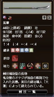 風華は初めて範囲回復を使った刀で35段から41段辺りまでメイン刀でした。
